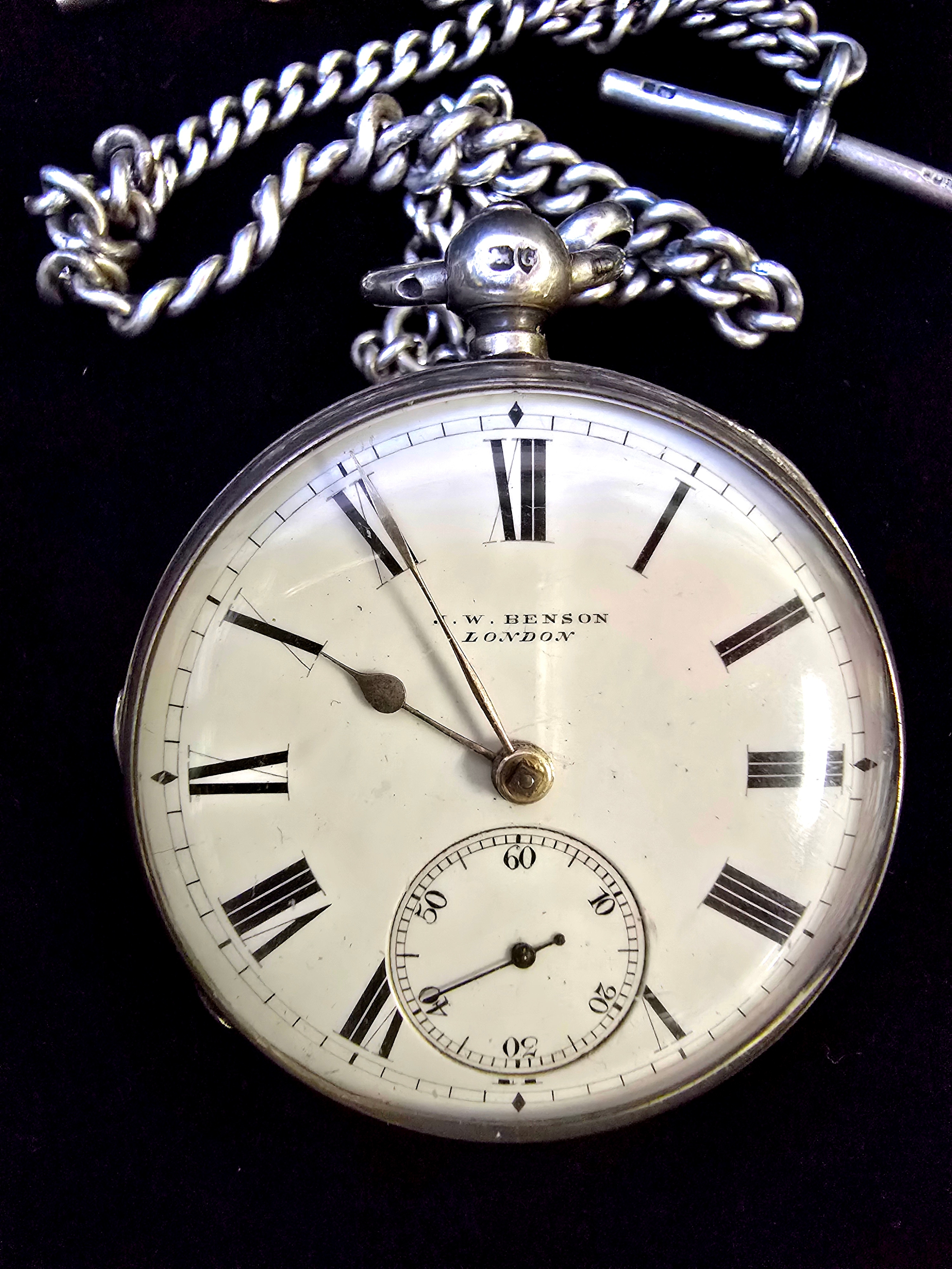 1882 Victorian J. W. Benson Silver Pocket Watch and w/ Silver Chain. Original Box