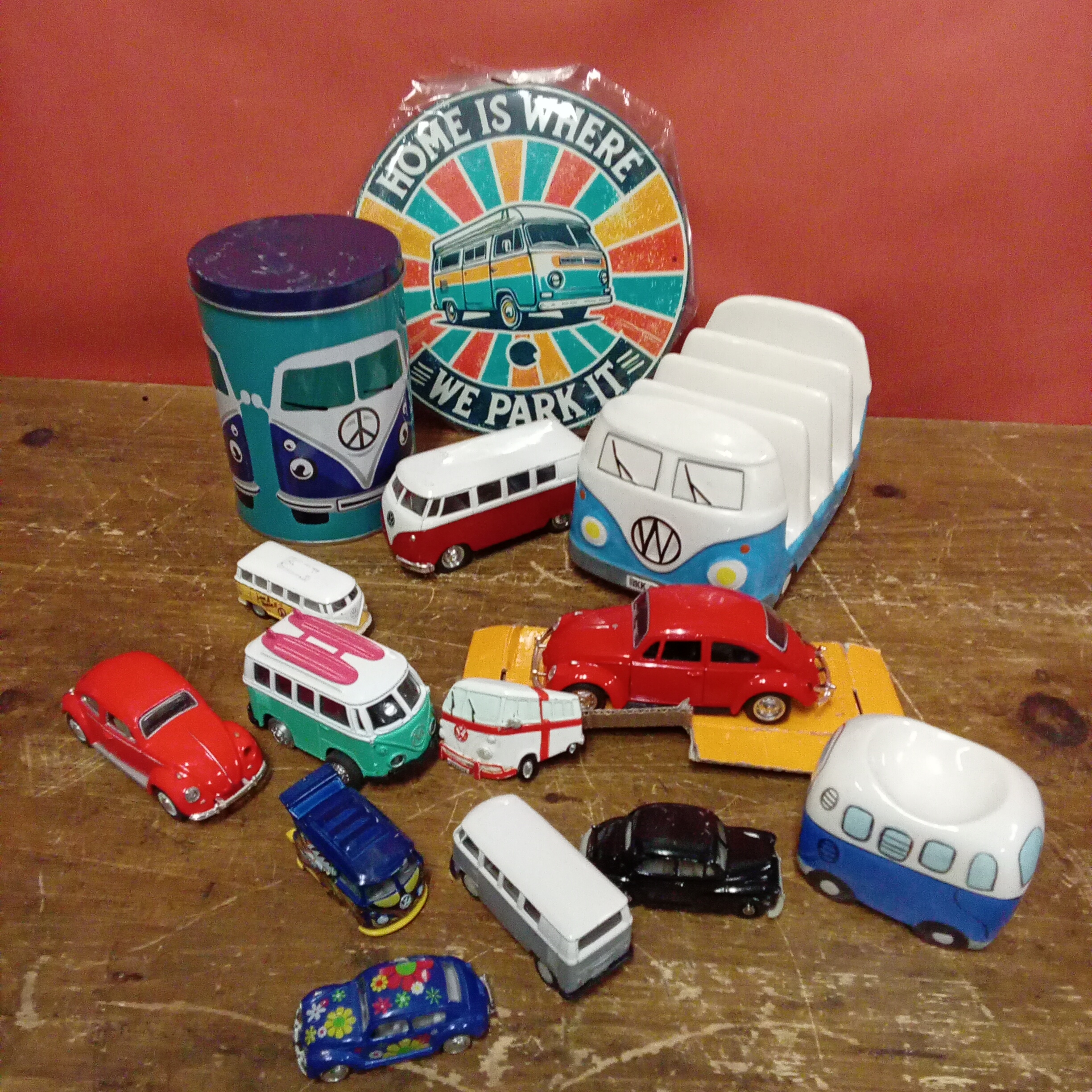 Job lot of VW beetle items to include cars, toast racks a plack and tin.