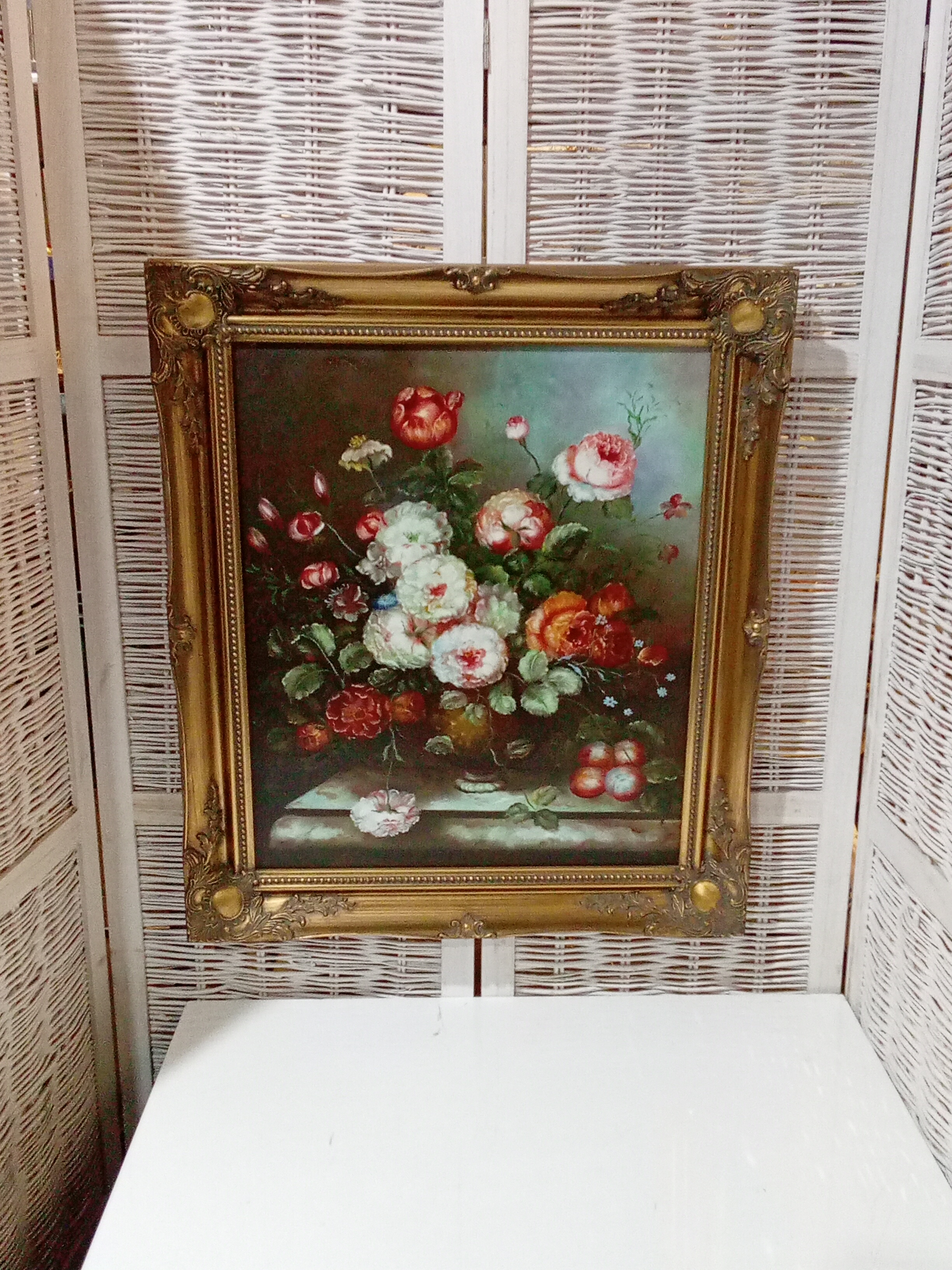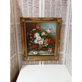 Rococo Style Wood Framed Oil on Canvas of Flowers in a Bowl. App. 30" x 26"